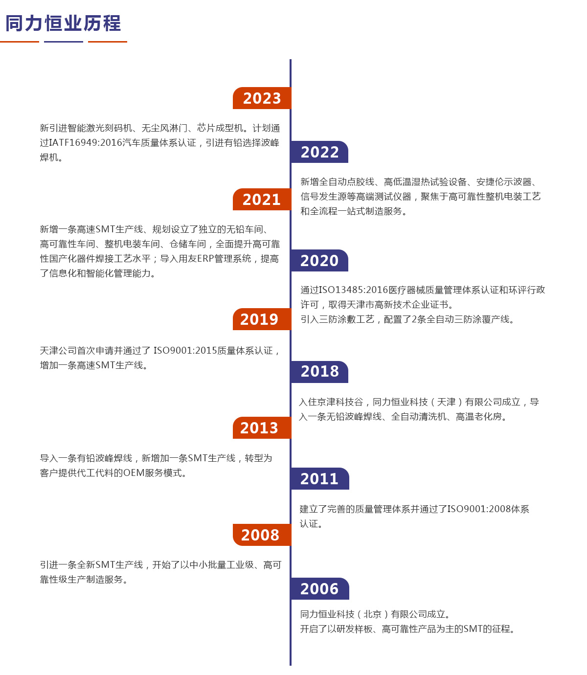 同力恒業科技成立于2006年,專業從事電子制造服務(EMS),專注于為客戶提供產品開發、工藝設計、物料配套、精密貼裝、插件焊接、三防涂敷、整機電裝、測試老化以及包裝運輸、售后維修等整個供應鏈解決方案。公司定位于高可靠性及中高端產品電子制造服務,在通訊導航、儀器儀表、醫療設備、汽車電子等領域具有豐富的一站式制造服務經驗。